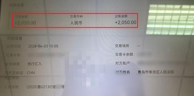 田先生给记者提供的自己的工商银行账号信息显示,4月3日下午3:05,他收到了李沧区法院支付的那2050元案款,“交易详情”一栏还备注有他的一审判决书案号。